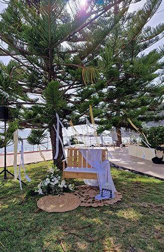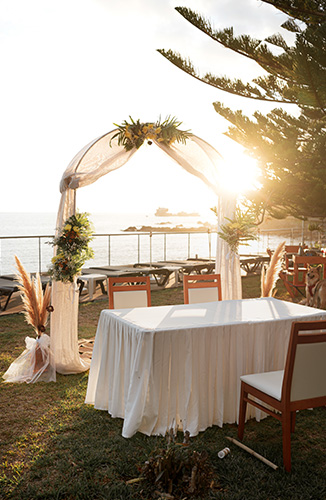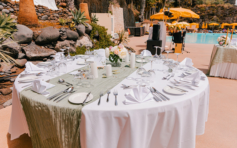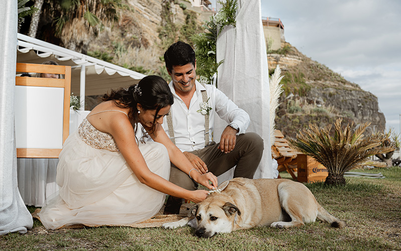 In the lush gardens of Hotel Orca Praia, with the Atlantic as a backdrop, this beautiful June wedding brought together love, family, and a touch of whimsy. The ceremony took place by the pool, surrounded by vibrant florals and elegant decor. Guests dined under the stars—joined by a very special guest: the couple’s beloved dog, proudly part of the celebration.